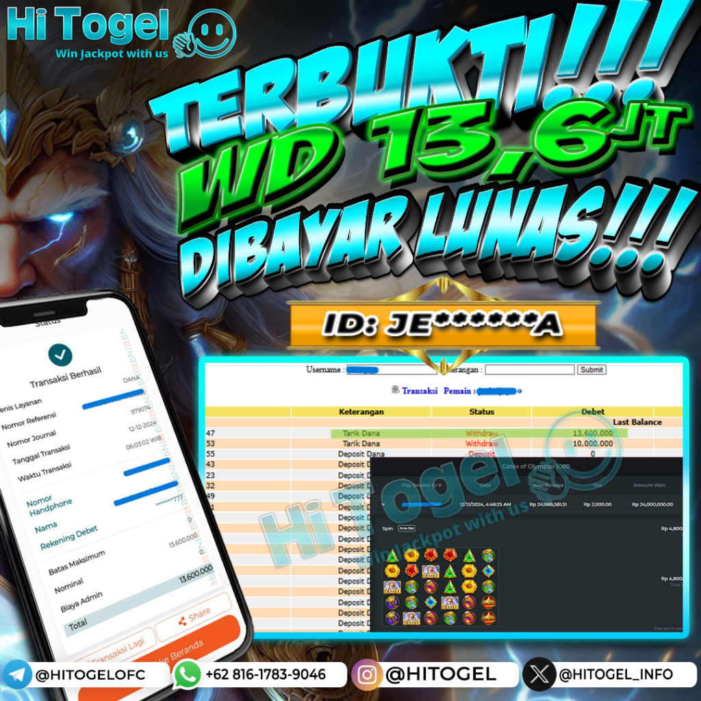 Bukti JP & WD Pemain HiTogel #298 hitogelofficial December 12, 2024 Bukti WD Bukti JP & WD Pemain HiTogel #298 Selamat atas kemenangannya!!User ID : je*****aPermainan: Gates Of Olympus 1000 (Pragmatic Play)Total Withdraw: Rp 13,600.000,-LUNAS!!!