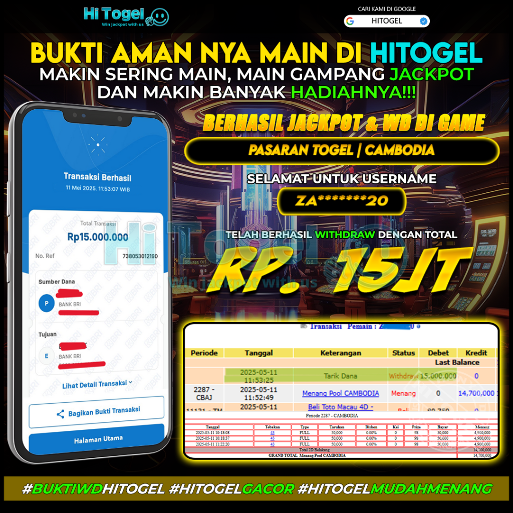 Bukti JP & WD Pemain HiTogel #361 hitogelofficial May 11, 2025 Bukti WD Bukti JP & WD Pemain HiTogel #361 Selamat atas kemenangannya!!User ID : za*****20Permainan: Cambodia Pool Periode 2287 (Result: 7143)Total Withdraw: Rp 15,000.000,-LUNAS!!!