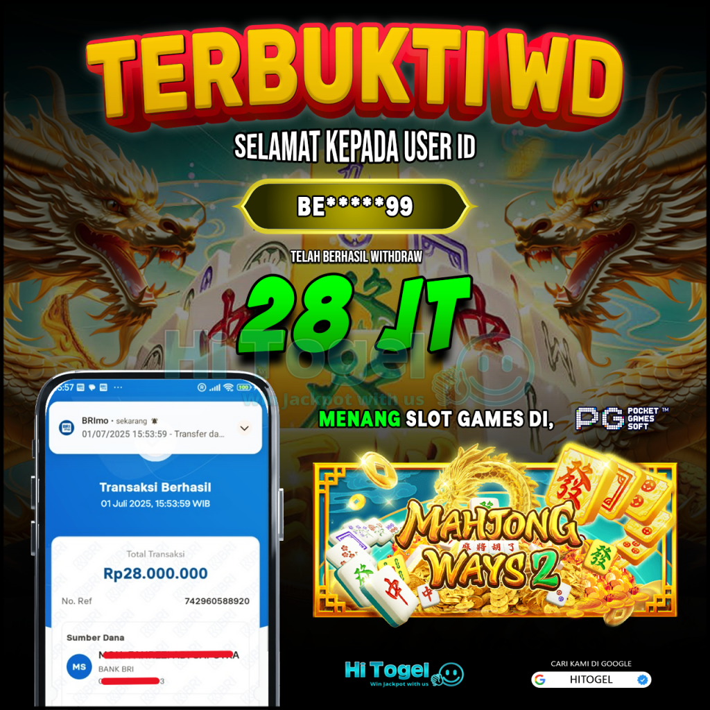 Bukti JP & WD Pemain HiTogel #392 hitogelofficial July 1, 2025 Bukti WD Bukti JP & WD Pemain HiTogel #392 Selamat atas kemenangannya!!User ID : be*****99Permainan: Mahjong Ways 2 (PG Soft)Total Withdraw: Rp 28,000.000,-LUNAS!!!