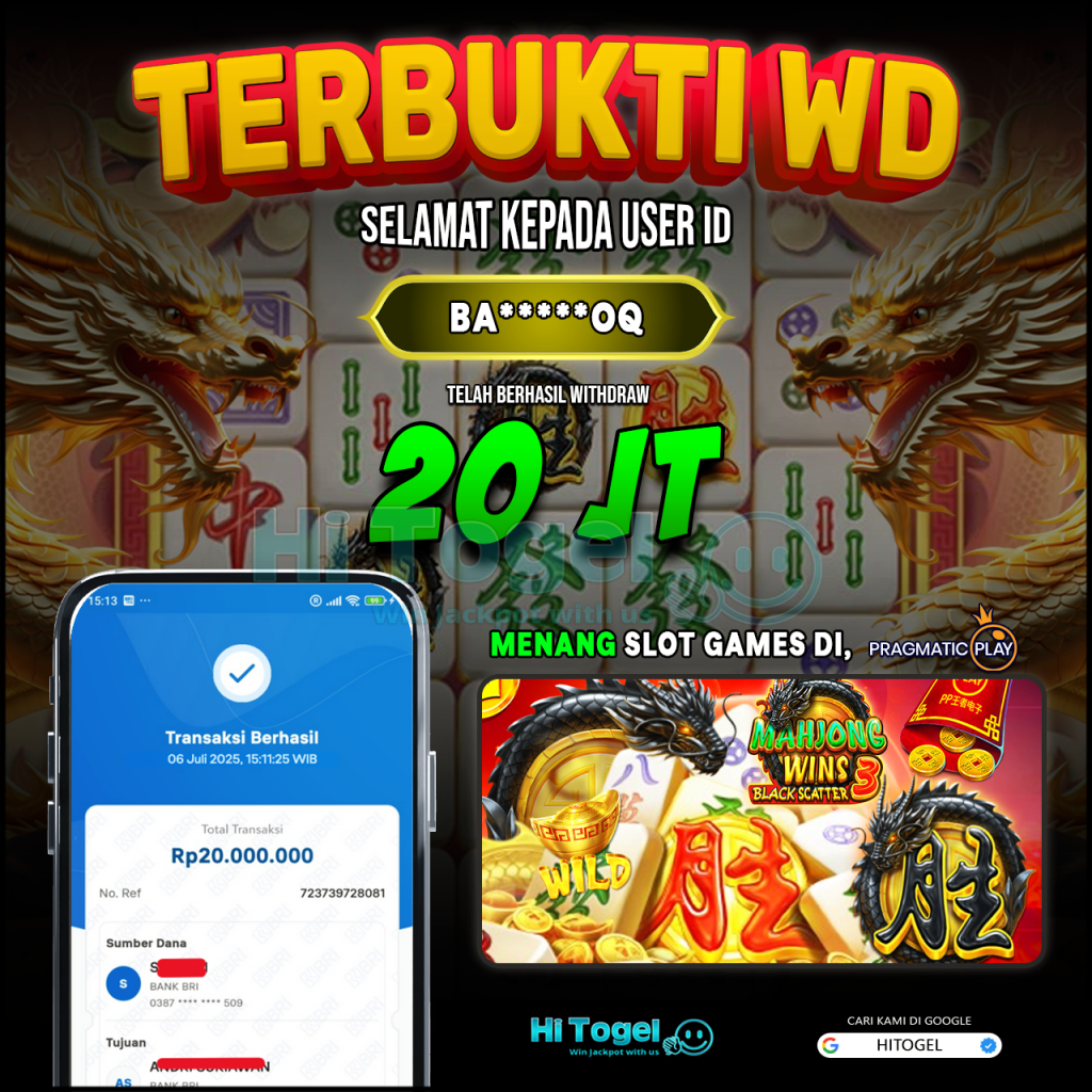 Bukti JP & WD Pemain HiTogel #396 hitogelofficial July 6, 2025 Bukti WD Bukti JP & WD Pemain HiTogel #396 Selamat atas kemenangannya!!User ID : ba*****oqPermainan: Mahjong Wins 3 Black Scatter (Pragmatic Play)Total Withdraw: Rp 20,000.000,-LUNAS!!!